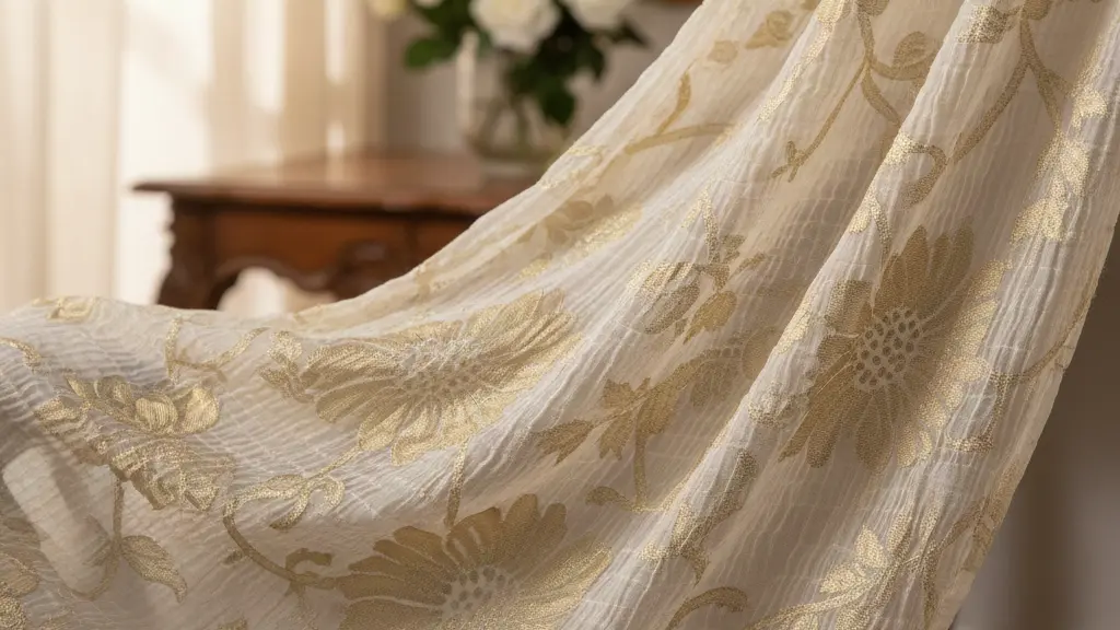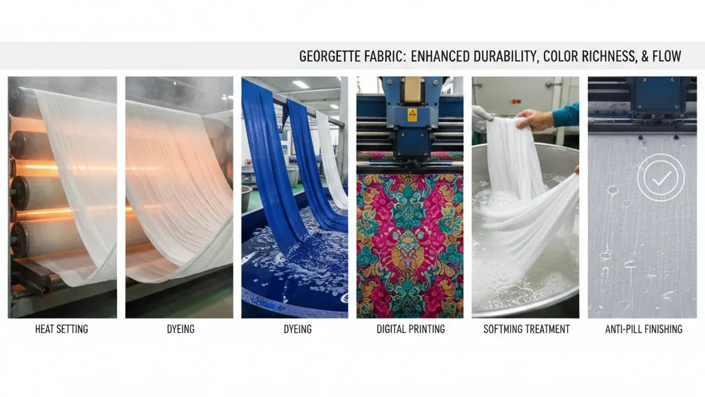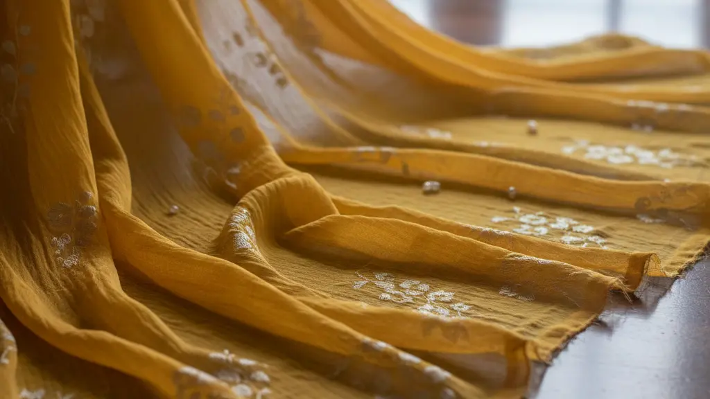 Georgette is a sheer, lightweight, dull-finished woven fabric with a slightly crinkled texture. It is traditionally woven using highly twisted yarns, which create its signature crepe-like surface.