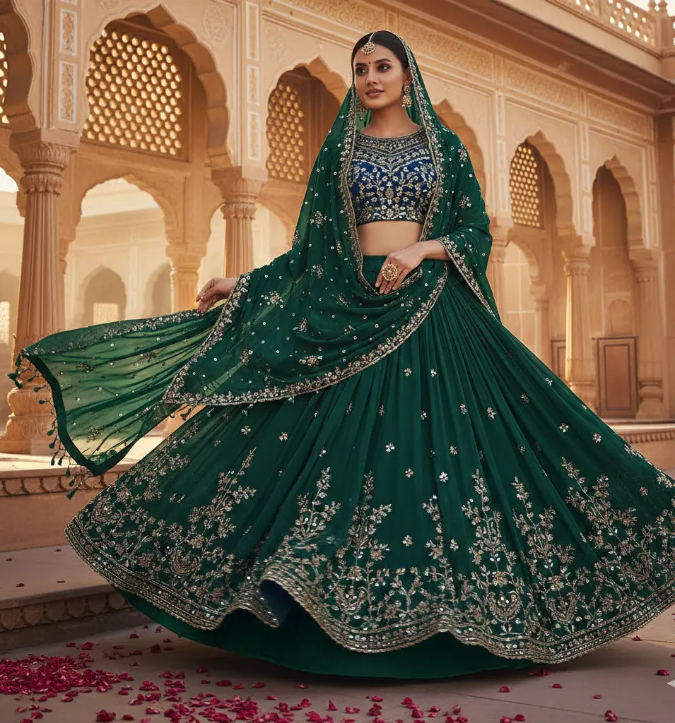 Decorated with thread work, zari, sequins, beads — used in party and bridal wear.