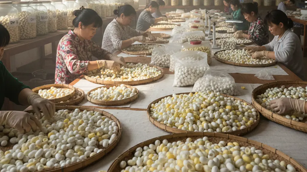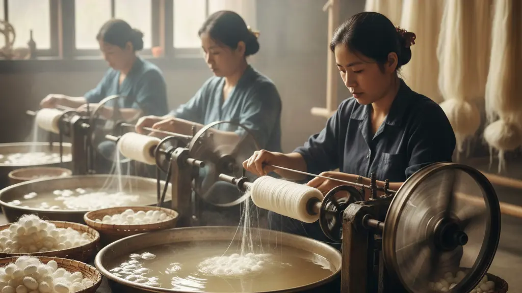 Cocoons are placed in warm water → sericin softens → the filament is unwound.