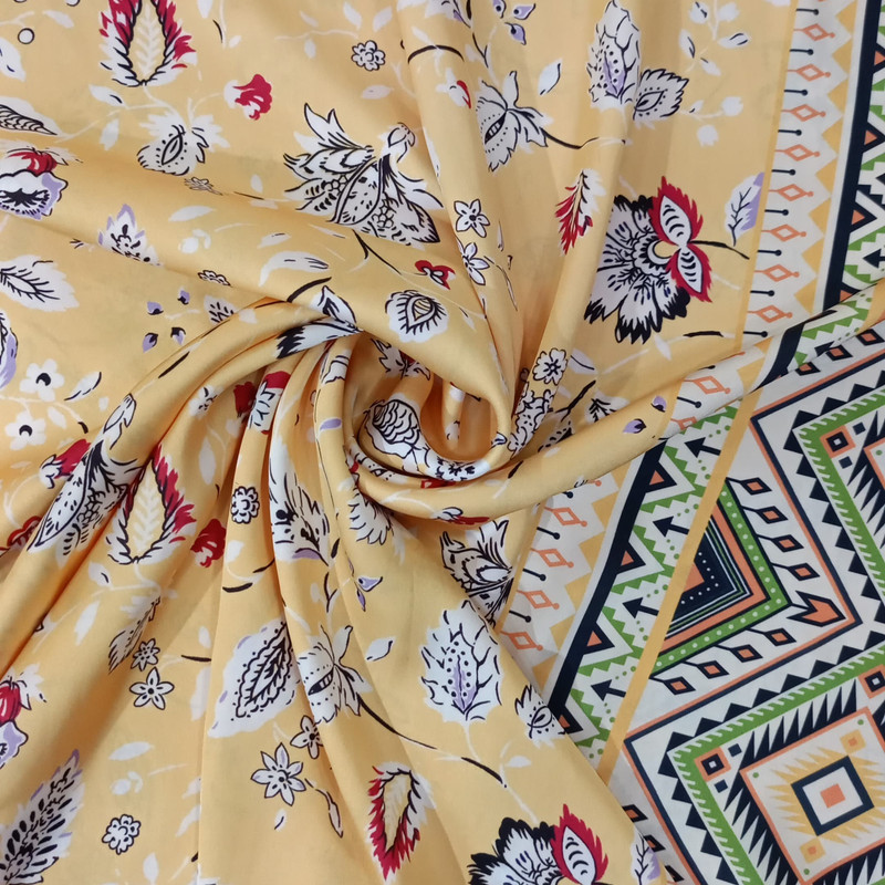 Elevate your fashion creations with our Bohemian Border Floral Print on Korean Satin fabric. This premium 100% polyester fabric features a captivating floral border design, printed on lustrous Korean satin. With a width of 150 cm and a GSM of 85, it offers a soft and smooth texture, ideal for crafting stylish dresses, skirts, and accessories. Whether you're designing for casual wear or special occasions, this fabric adds a touch of boho-chic elegance to any project.