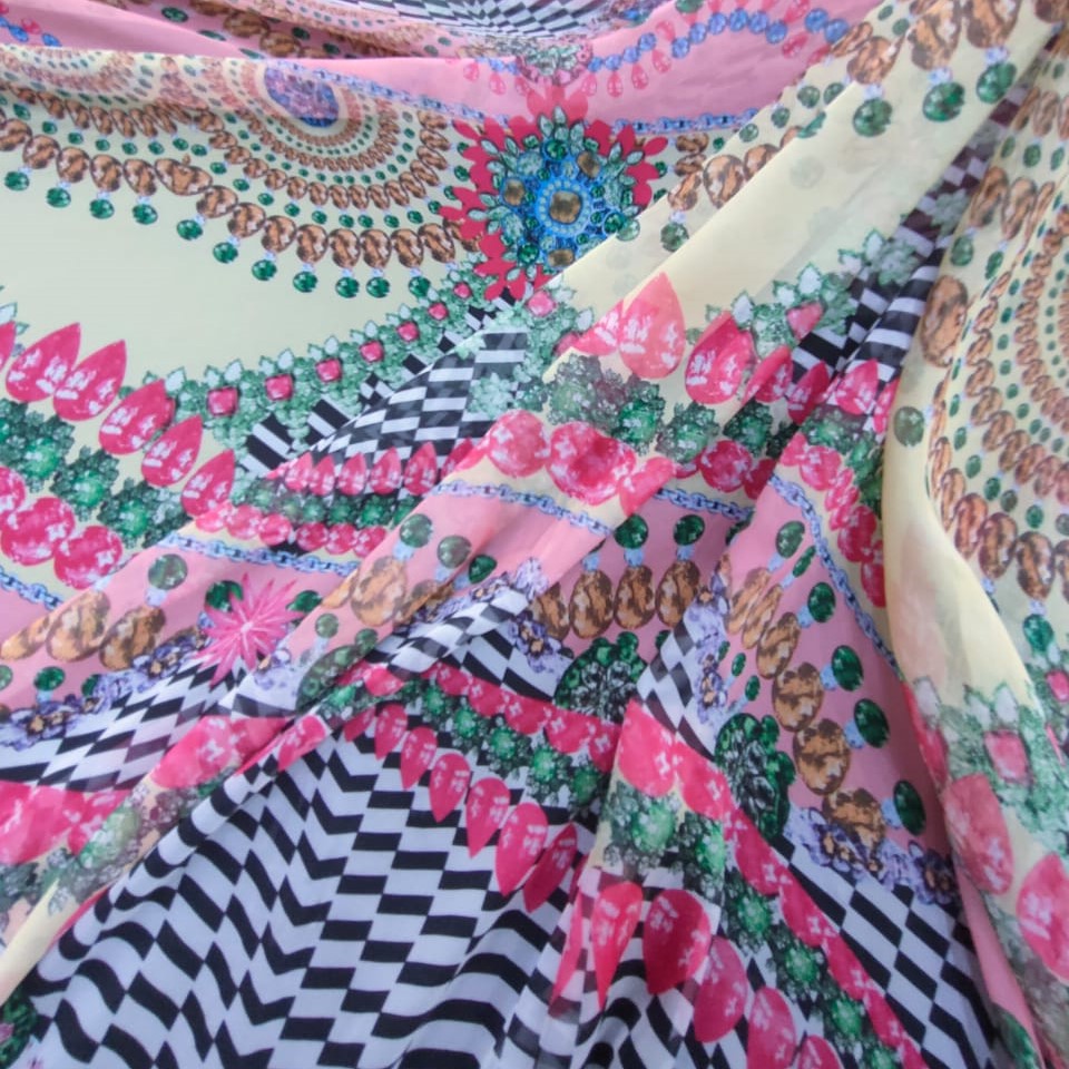Elevate your wardrobe with the Traditional Print Flat Chiffon. This exquisite fabric combines delicate traditional patterns with a modern touch, making it perfect for elegant dresses, flowing scarves, and stylish tops. Its lightweight and semi-transparent nature ensures comfort and sophistication in every outfit. Ideal for creating both classic and contemporary looks, this fabric offers endless possibilities for fashion enthusiasts and designers alike.